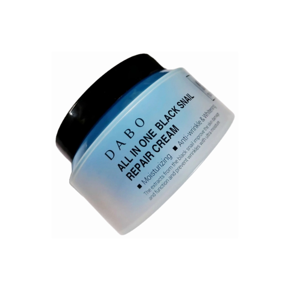 DABO All In One Black Snail Repair Cream—This multi-functional skincare essential transforms the skin with advanced repair, hydration, and rejuvenation. It is infused with black snail mucin extract, which has regenerative properties to help repair damaged skin, enhance elasticity, and reduce the presence of acne scars and blemishes for brightened and more youthful skin.A unique powerhouse blend of nature and technology offering the best of both worlds to solve multiple skin concerns in one high-performance formula. Infused with niacinamide to brighten dull skin and even skin tone and adenosine to minimise the appearance of fine lines and wrinkles. Centella Asiatica and Green Tea Extract provide calming properties for sensitive and irritated skin while ensuring a soothed complexion.