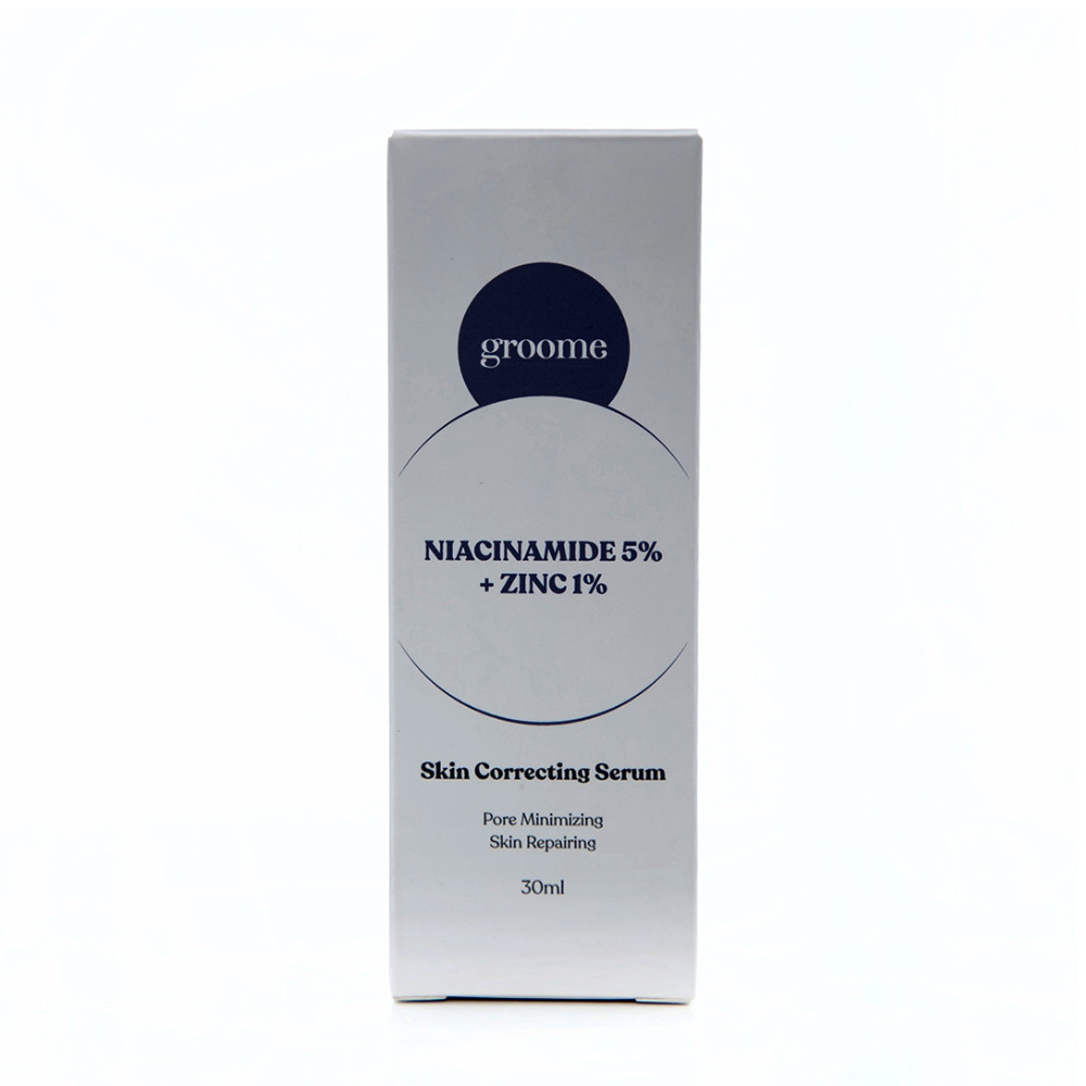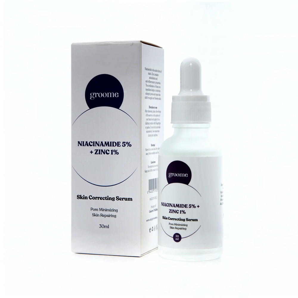 Groome Niacinamide 5% + Zinc 1% Skin Correcting Serum boosts skin health and glow. This serum efficiently treats acne, pimples, and uneven skin tone. It absorbs fast without sticking owing to its lightweight texture. Vitamin B3 niacinamide improves skin barrier function. It improves skin moisture retention and reduces transepidermal water loss. Natural anti-inflammatory zinc calms sensitive skin. A smoother complexion is achieved by controlling oil production and unclogging pores. Regular use of this serum lowers redness and pores. The formula suits delicate skin. It balances greasy skin without drying. Reduces hyperpigmentation to help acne scars recover. The serum is paraben-, chemical-, and fragrance-free. It is dermatologist-tested and daily-safe. The bottle has a dropper for accurate application. This product suits all skin types and genders. Use consistently for a brighter, more even complexion. It works wonderfully under makeup or at night. Use it with a decent moisturizer for optimum results. Environment-induced oxidative stress is reduced by this serum. Healthy skin cell turnover means fresher skin over time. This skincare product is inexpensive and effective. Groome's serum is nongreasy and light. It immediately penetrates skin without blocking pores. Niacinamide improves skin suppleness. Zinc promotes skin repair and prevents acne. This serum controls shine for oily skin. It also lowers pollution and weather discomfort. Multitasking product handles numerous issues. This serum reduces fine wrinkles and acne spots. It also fights dullness and brightens skin. Groome created this product for all skin care regimen. Gentle enough for regular usage yet strong enough to show results. Use the serum regularly for optimal results. Little products go far. Multiple products may be layered without pilling. It is versatile since it may be used throughout pregnancy and nursing. Dermatologists suggest patch testing before usage for compatibility. Clean and uncomplicated ingredients make it a reliable skincare staple. Nothing is tested on animals in this serum. It is vegan and uses no animal products. Groome produced an efficacy-focused solution for contemporary skincare. Customers remark skin texture and tone improvements after a few weeks. It helps acne-prone skin and prevents outbreaks. Calming characteristics minimize inflammation and redness. Using it regularly might give you healthy, bright skin.