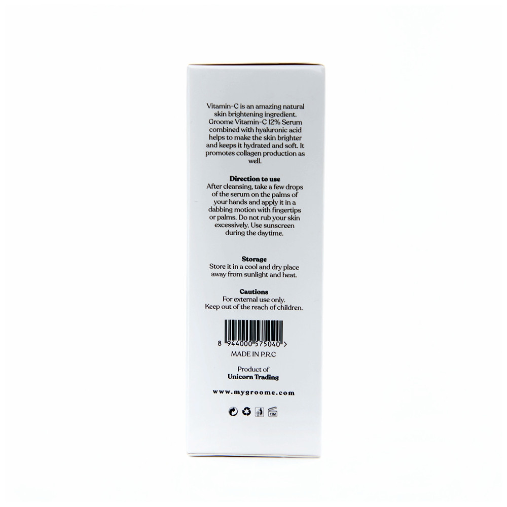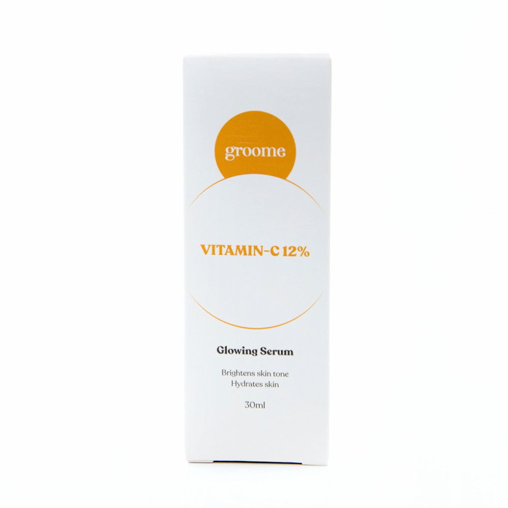 Groome Vitamin C Glowing Serum 12% (30ml) revitalizes dull skin. This serum includes pure Vitamin C, which brightens and rejuvenates. It efficiently reduces pigmentation and black spots. Skin absorbs the lightweight product rapidly. It suits all skin types, even sensitive ones. This serum smoothes and softens skin. Regular usage boosts skin vibrancy. The 12% Vitamin C is powerful yet skin-friendly. It addresses fine lines and wrinkles. Antioxidant-rich serum fights free radicals. This antioxidant protects skin from environmental harm. The non-greasy formula feels light on skin. Deeply hydrating, it provides long-lasting hydration. The serum suits daily and evening routines. Increased collagen synthesis improves skin suppleness. The bottle's design simplifies usage and storage. Parabens and sulfates are absent from the serum. Non-comedogenic and non-pore-clogging. Safe for acne-prone skin. Formula contains moisturizing elements to prevent dryness. Regular usage restores skin shine. A dermatologist assessed Groome's Vitamin C Serum for safety. The lightweight texture complements your skincare regimen. Without irritating skin, it compliments other skincare products. The 30ml bottle is travel-friendly. Its natural components protect and nourish skin. Not tested on animals. The serum suits all ages of men and women. Vitamin C effectively lightens uneven skin. It reduces inflammation and redness. The product is non-sticky. The product is for glowing, young skin. The serum has high-quality Vitamin C for noticeable benefits. It's cheap and good value. Customer reviews commend this serum's efficacy. Within weeks, it shows results. Regular use keeps skin young. It works nicely with sunscreen for midday protection. The serum is simple to use in skincare. It has clear directions for optimal outcomes. The subtle scent of Groome Vitamin C Serum is delightful. Artificial colors and scents are absent. It aids natural skin healing. Vitamin C boosts cell turnover for smoother skin. Big pores are reduced. Regular usage of the serum fades dark circles. It evens skin without inflammation. Groome has eco-friendly, stylish packaging. Serum is a good makeup foundation. Beginners to Vitamin C products will love it. This serum simply enhances skin brightness.