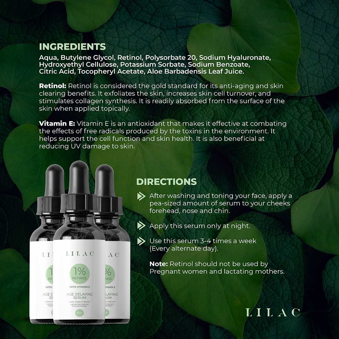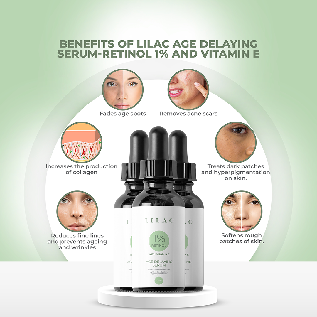 The latest price of Lilac Age Delaying Serum with Retinol 1% and Vitamin E 30ml is ৳780 in Bangladesh. You can purchase the Lilac Age Delaying Serum with Retinol 1% and Vitamin E 30ml in Bangladesh at the best price from our website or any of our stores.